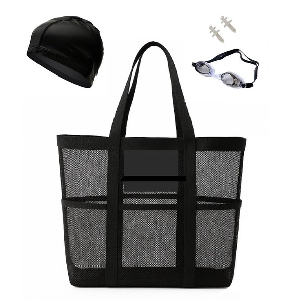 NexTrendy 3 Piece Swimming Set Pool Bag Swim Goggles Swim Cap Ear Plugs (Black, Mesh, Large)