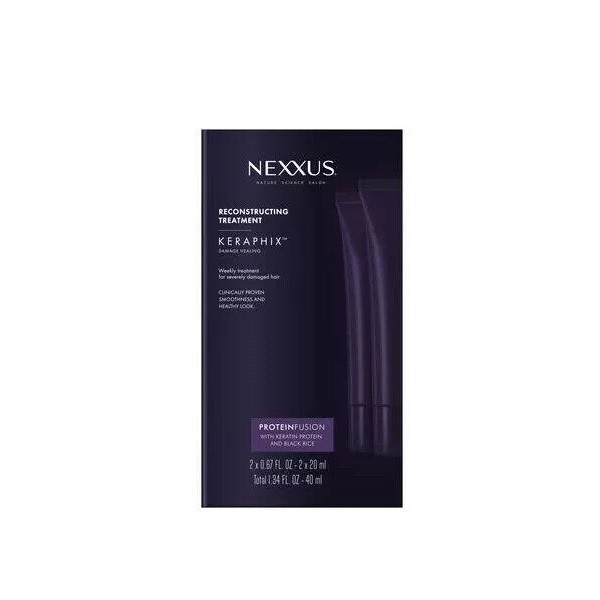 Wash your hair and then apply Hair Reconstructing Treatment and leave on hair for up to 5 minutes. Shampoo again to rinse away excess treatment and follow with Nexxus Keraphix Damage Healing Conditioner.