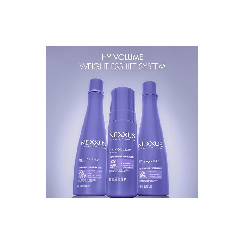 It's time for a volume revolution with New Nexxus HY-VOLUME Weightless Lift Collection, get 3x weightless, healthy volume in 1 use. The collection has a revitalizing aroma of citrus breeze fragrance with uplifting white citrus notes balanced with delicate floral tones for long-lasting freshness. Nexxus HY-VOLUME Weightless Lift Conditioner is powered by our first hyaluronic tubing technology for hair to instantly strengthen, plump and lift every hair strand from root to tip for 48h of gravity defying volume on repeat. Our formula contains our exclusive proteinfusion blend with collagen protein and hyaluronic acid. The silicone-free Conditioner penetrates the hair core to moisturize from within. The formula binds to water molecules to retain moisture deep within hair for long lasting hydration. It also swells and expands each hair's cortex to physically plumps each hair strand. Continued use will minimize split-ends and breakage to maintain the hair you have, while enhancing resilience and vitality. To achieve the best results, start with Nexxus HY-VOLUME Shampoo. Spread the conditioner through wet hair and rinse thoroughly. Follow with HY-VOLUME Cloud Foam. The combination of these products will give you salon-quality hair right at home. Born in salons and perfected by science, our Nexxus collections were crafted by our team of expert scientists and stylists. At Nexxus, we care about your hair health from shower to style. All of the shampoos and conditioners have our exclusive h4 complex to restore and protect the 4 signs of hair health: strength, moisture, elasticity, and shine. Our styling collection has our exclusive StyleProtect Technology to protect hair from damage as you style. By choosing Nexxus, you know you are doing something for your hair, not to your hair, ensuring you always look your best.