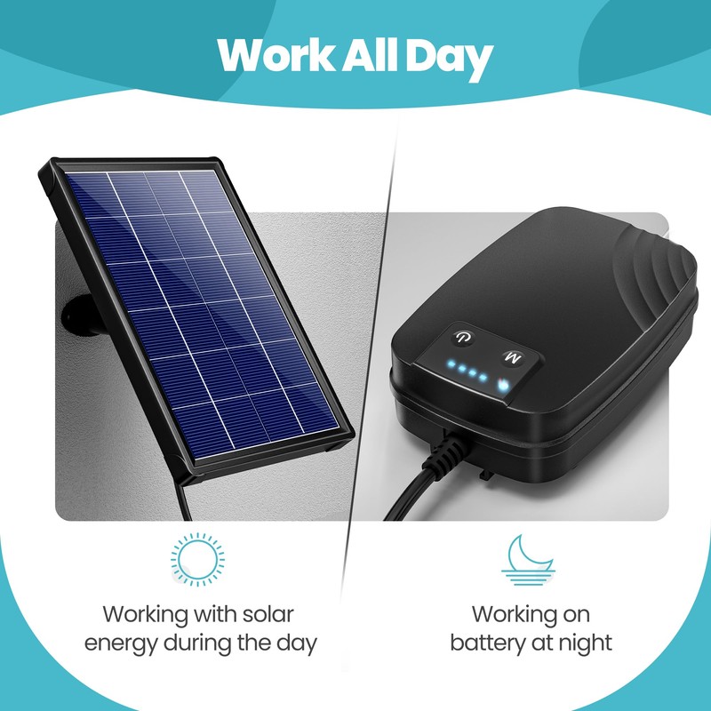 - Solar Powered Pond Aerator with Battery The solar air pump is powered by solar panel during the day and battery at night. Even if there is no sun, it can work on the battery for more than 16 hours (On strong bubble mode).