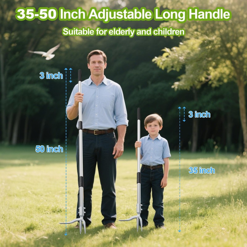 Introducing the Weed Puller Tool, your ultimate companion in maintaining pristine lawns and gardens. This innovative weeder is meticulously designed to simplify your gardening experience, ensuring you can enjoy weed-free surroundings without the usual back-breaking labor. Our weed puller tool stand up heavy duty model is crafted with high-strength stainless steel, promising durability and reliability even in the toughest soil conditions. Equipped with a length-adjustable pole, the weed picker tool offers a customizable experience, allowing users of all heights to operate it with ease. Say goodbye to the discomfort of bending over, as this weeding tool enables you to remove weeds from their roots while standing comfortably. Our weed remover tool features a comfortable grip, designed to reduce hand fatigue during extensive gardening sessions, making it an ideal choice for gardening enthusiasts and agricultural workers alike. The weed puller tool with long handle is nothing short of an engineering marvel, boasting an efficient and comfortable design that makes manual weeding a breeze. Its 4-claw mechanism ensures a firm grip on dandelions, crabgrass, thistles, and other invasive weeds, ensuring they are extracted from the roots effortlessly. This high-quality gardening tool is not only labor-saving but also widely applicable for yards, lawns, terraces, and gardens. Installation is a breeze with our simple and detachable design, allowing you to set up and store the tool conveniently. The weed tool is built to protect your back, reducing the strain of traditional weeding methods. Our innovative design ensures each gardening session is as efficient and enjoyable as possible. Invest in the weeder tool today, and transform your gardening routine with ease. Whether you're a seasoned gardener or an aspiring green thumb, our gardening hand tools are your trusted ally in achieving a beautiful, weed-free landscape. Discover the unparalleled efficiency and comfort of our weed accessories and garden tools, and elevate your gardening experience to new heights.