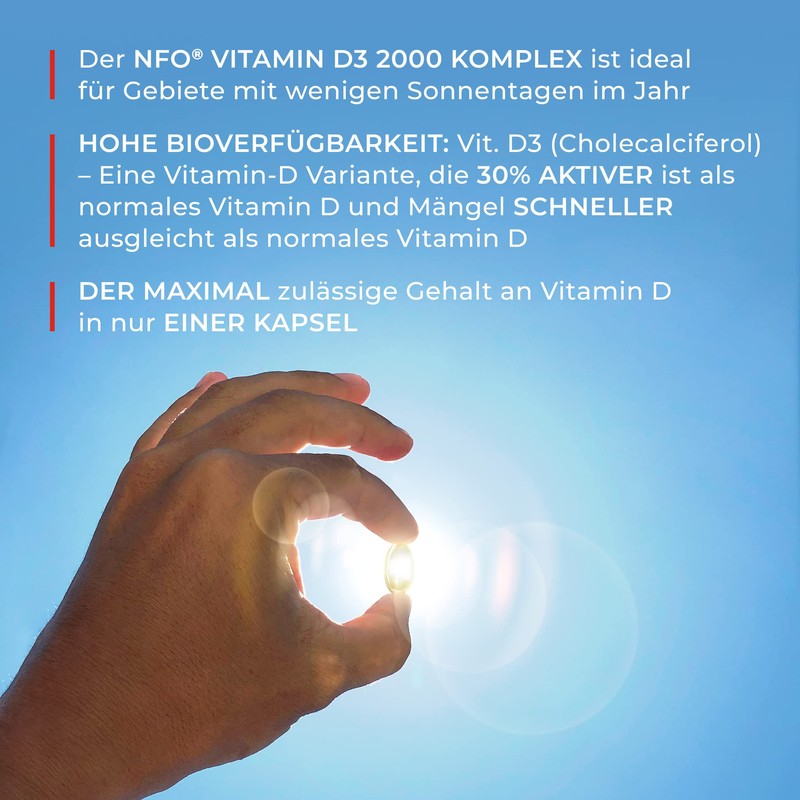 - Reinforced vitamin D formula – NFO The vitamin D3 2000 complex is the enriched formula needed to correct vitamin D deficiency in the human body. Maximum permissible content of vitamin D in one capsule: 2000 IU (International Units) or 50 μg (micrograms). Vitamin D is produced in the skin by exposure to the ultraviolet rays of sunlight. The NFO Vitamin D3 2000 complex is ideal for regions with a low number of sunny days per year