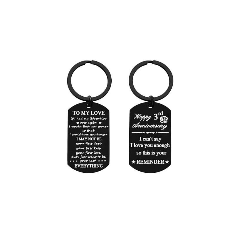 - This cute keychain one side engraved"Happy Anniversary. I can't say I love you enough, so this is your REMINDER". The other side engraved "To My Love if i had my life to live over again i would find you sooner so that i could love you longer i may not be your first date your first kiss your first love but i just want to be your last everything"