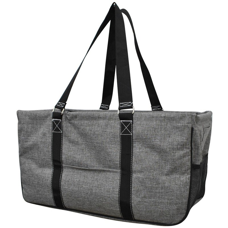 Cute multipurpose classic utility tote bag. Collapse market basket when not used. Constructed with water resistant nylon material. Push down metal bars and velcro to maintain the rectangle bag shape. Open tote bag style. The size of the bag is 23 x 10 x 10. Extra large tote size classic open utility tote bag. Can be used as shopping bag (warehouse clubs), overnight, weekender bag, beach bag, storage basket, craft bag, closet organizer basket and more! Haul your tools, groceries, beach towels, or camping gear on the go. Open top makes it easier to throw and pick up things in the bag. Convenient side mesh pockets and mini open pockets for small items. Double carrying handles. Handle drop approximately 13". Monogram Ready (Monogram sold Separately). Great gift idea for your friends and family.