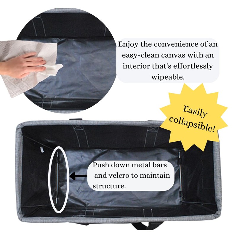• ② Constructed with water resistant canvas material. Push down metal bars and velcro to maintain the shape of the bag. Open basket style
