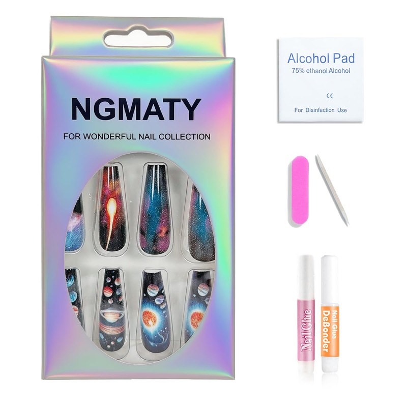 NGMATY Cosmic Starry Press On Nails Long Coffin - Fantasy Planet & Moon Design, Black Night Sky Fake Nails, Glossy Full Cover Glue on Nails for Women, Ballet Shape Nail Art Set(Stellar Dreamscape)