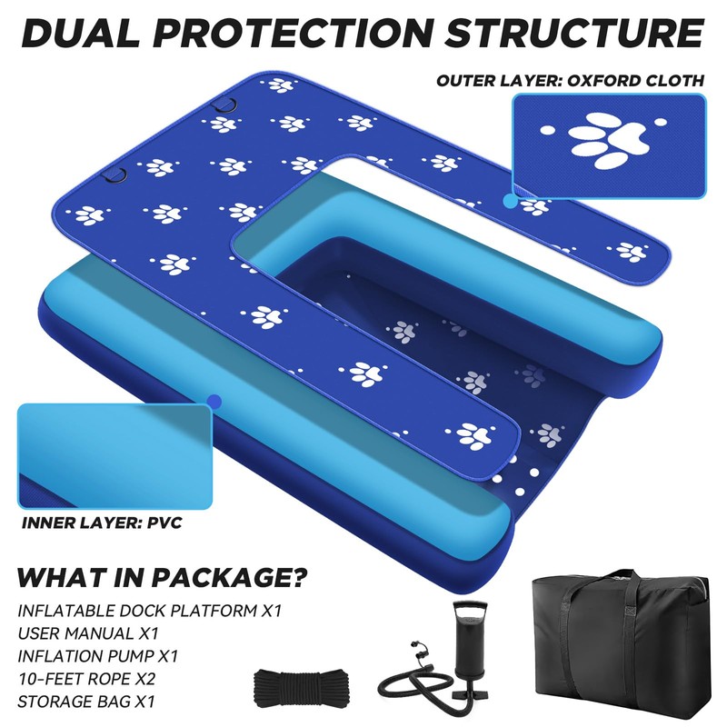- [Safety Inflatable Dock Platform] - The surface is made of anti slip Oxford cloth, which helps prevent slipping when climbing in and out of the water surface. Dual non-slip Oxford and PVC entry system combines stabilizing mesh, graduated traction platforms, and low-profile buoyancy control. Ensures confident water entry/exit for dogs of more sizes while preventing ramp displacement