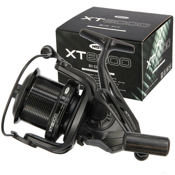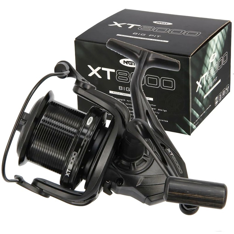 - The XT8000 Big Pit Rapid Front drag reel comes with a 5+1 ball bearing system, high strength nylon body and rotor. The reel also features a robust and durable drag system, perfect for those who like to fish for big carp. Rapid Front drag system Aluminium Spool with enlarged capacity Oversized drag knob 5 + 1 Ball Bearings Dual metal line clips Anti-reverse system Left / Right handed Gear Ratio - 4.4:1 Line Capacity (mm/m) - 0.3/430, 0.35/315 Reel Weight - 610g Model: XT8000 Brand: NGT