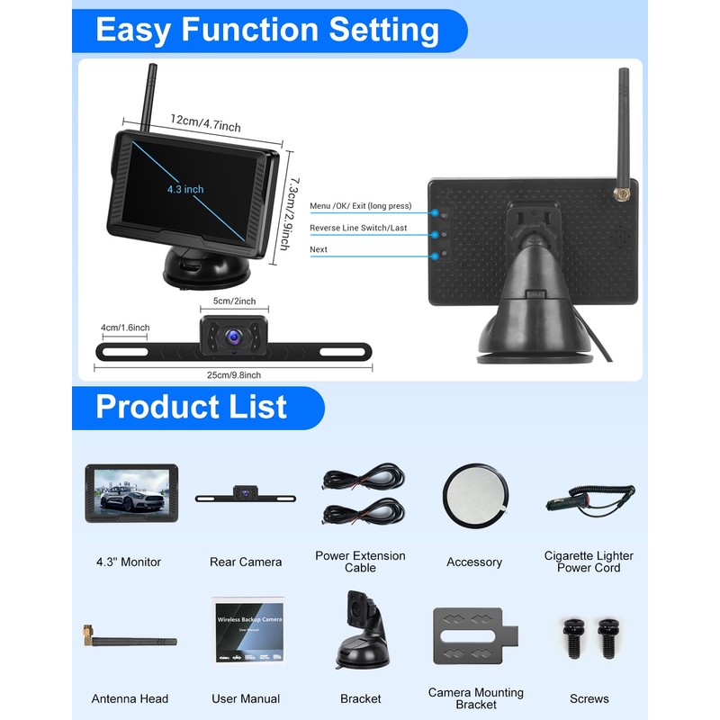 - Tiny Wireless Installation The revolutionary plug-and-play setup eliminates complex wiring. The monitor's suction cup securely attaches to dashboards/windshields, while the license plate mounted camera seamlessly integrates with your vehicle's aesthetics. No technical expertise required