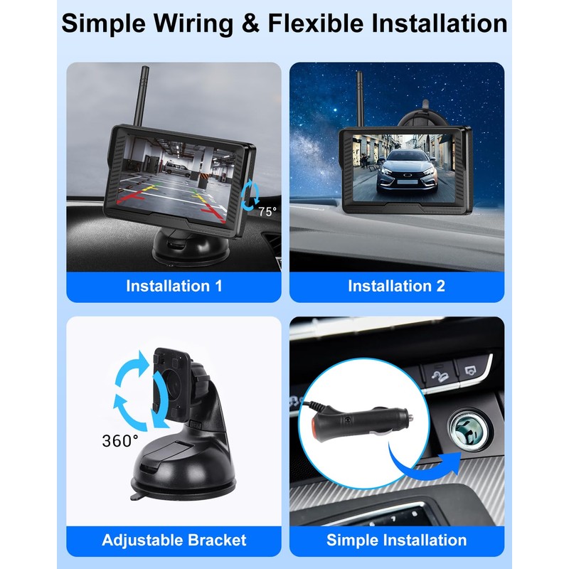 • Tiny Wireless Installation The revolutionary plug-and-play setup eliminates complex wiring. The monitor's suction cup securely attaches to dashboards/windshields, while the license plate mounted camera seamlessly integrates with your vehicle's aesthetics. No technical expertise required