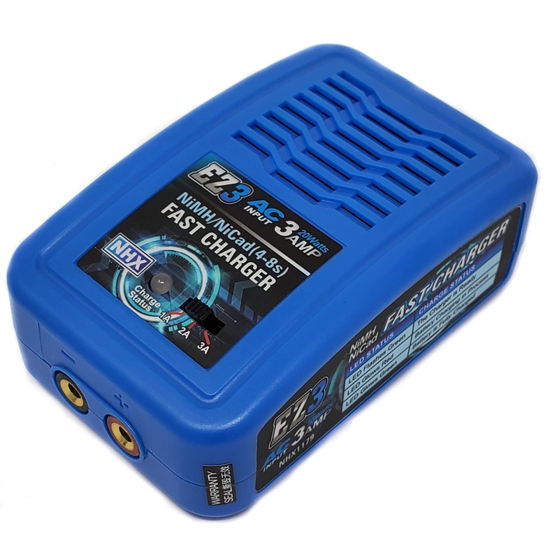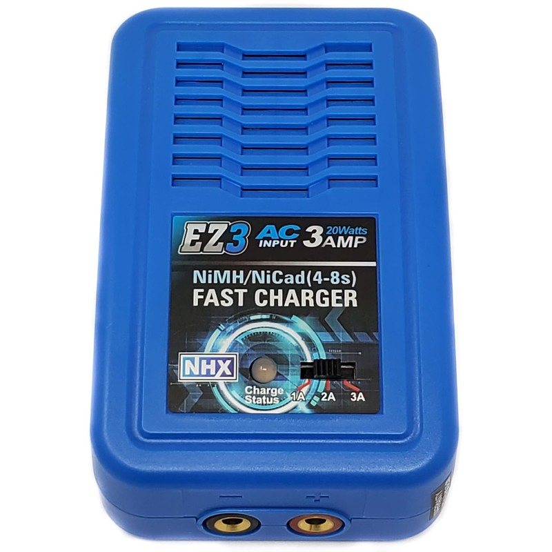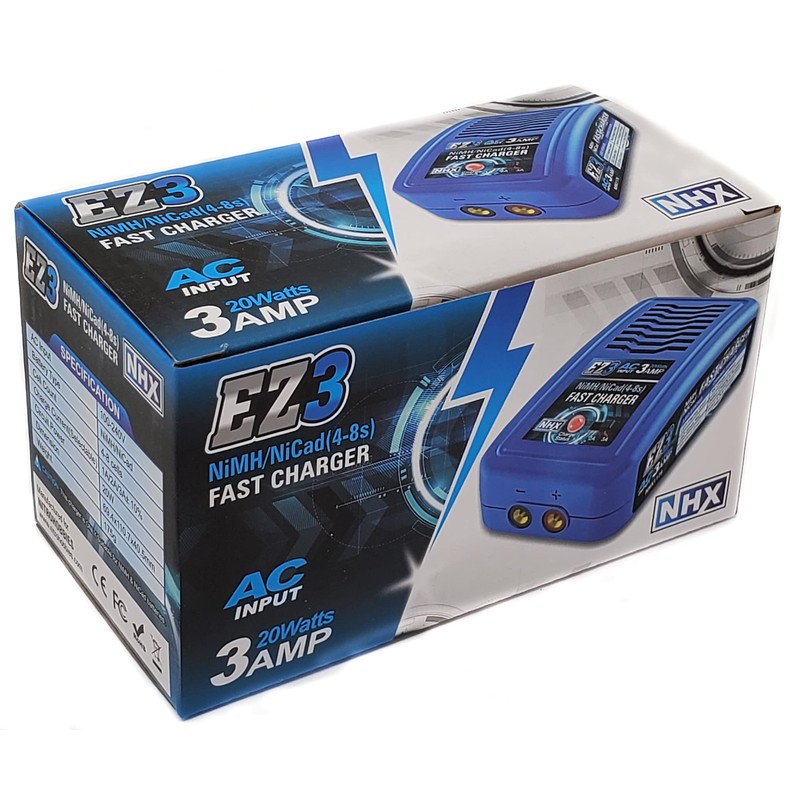 NHX EZ3 NiMH / NiCad FAST Charger is an economic, high quality 100-240V AC Charger, designed for charging NIMH & NiCad Batteries from 4-8 Cell. The Circuit Power is 20W & Max Charge current can reach to 3A. There are three kinds of charge current 1A/2A/3A that can be selected. You could select the proper charge current according to battery capacity.