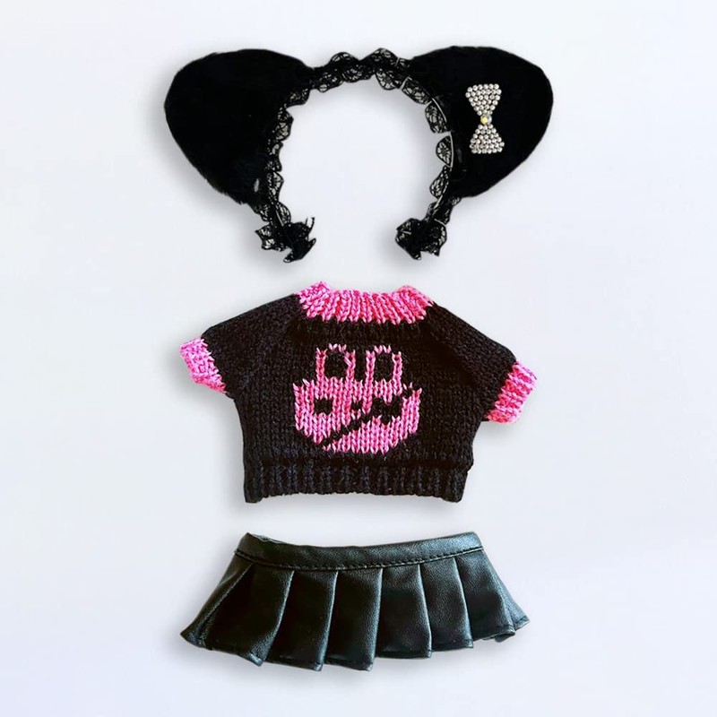 niannyyhouse 20cm Plush Clothes Headwear Kitten Sweater Leather Skirt Cotton Doll Clothes Change Dress (Black + Pink)