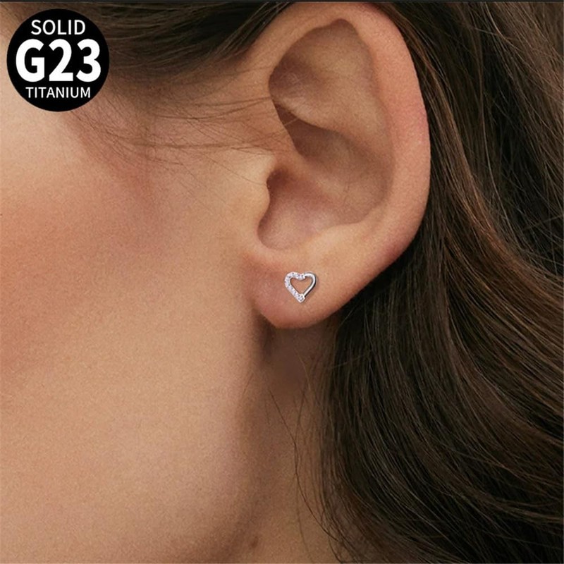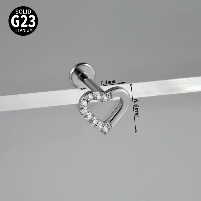Elevate your piercing style with these sophisticated heart-shaped labret studs. Crafted from premium G23 titanium, these 16-gauge studs feature sparkling cubic zirconia accents that add a touch of glamour to your look. The flat-back design ensures comfort during wear, while the internally threaded construction makes insertion smooth and easy. These versatile 8mm studs are perfect for various piercing locations including lip, conch, helix, tragus, and nostril. The hypoallergenic titanium material makes these studs suitable for sensitive skin. Each piece showcases meticulous attention to detail, from the precisely cut CZ stones to the smooth, polished finish. Whether you're updating your piercing collection or looking for everyday wear jewelry, these labret studs offer both style and practicality.