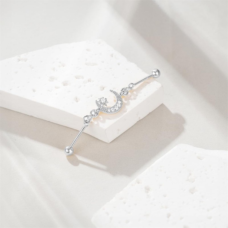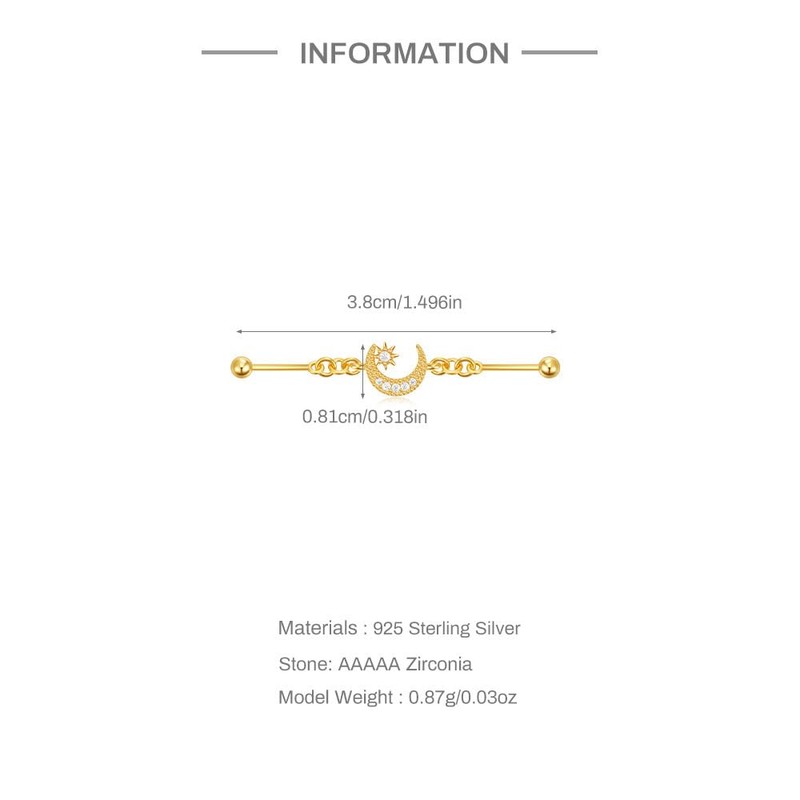 Niaspi 18G S925 Sterling Silver Chain Industrial Piercing Jewelry 18K Gold Plated CZ Moon Cartilage Industrial Barbell Earrings for Women, 20g, Sterling Silver, no gemstone