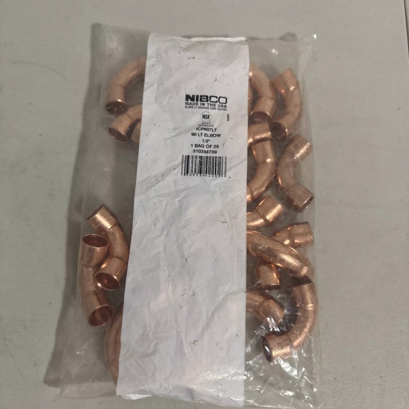 This 25 pack of 1/2" Nibco 90° long turn elbow cup x cup fittings is perfect for your plumbing needs. Made of high-quality copper, these fittings are compatible with Nibco brand and have a manufacturer part number of ICP607LT. The model number is also ICP607LT and it is compatible with the same model.