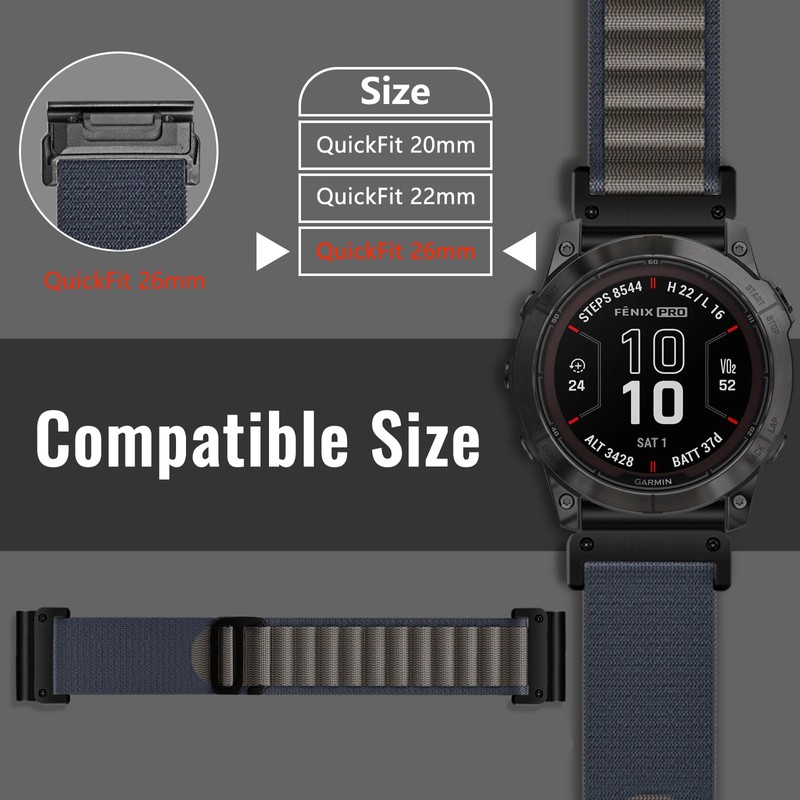• Compatible models: Niboow nylon QuickFit 26 mm strap for Garmin Enduro 3/Garmin Fenix 8 51 mm/Garmin Descent Mk3i/Garmin tactix 7 Amoled/Garmin Fenix 7X Pro Solar/Garmin Fenix 7X/Garmin Quatix 7X - Solar Edition/Garmin Quatix 6X Solar/Garmin Fenix 6X/Garmin Fenix 6X Pro/Garmin Fenix 6X Sapphire /Garmin Sapphire /Garmin Fen5X/Garmin Fenix 5X GPS/Garmin Fenix 5X Puls/Garmin Tactix 7 Pro Edition/Garmin Enduro 2/Garmin Descent Mk1/Garmin Descent Mk2/Garmin Descent Mk2i/Garmin D2 Delta PX
