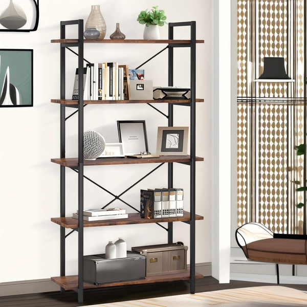 NicBex Bookshelf 5-Tier Bookshelf Modern Industrial Bookcase with X-Shape Back Stylish 63 Inch Tall Bookshelf Free Standing Bookcase with Metal Frame Bookcase for Study, Home Office, Brown