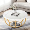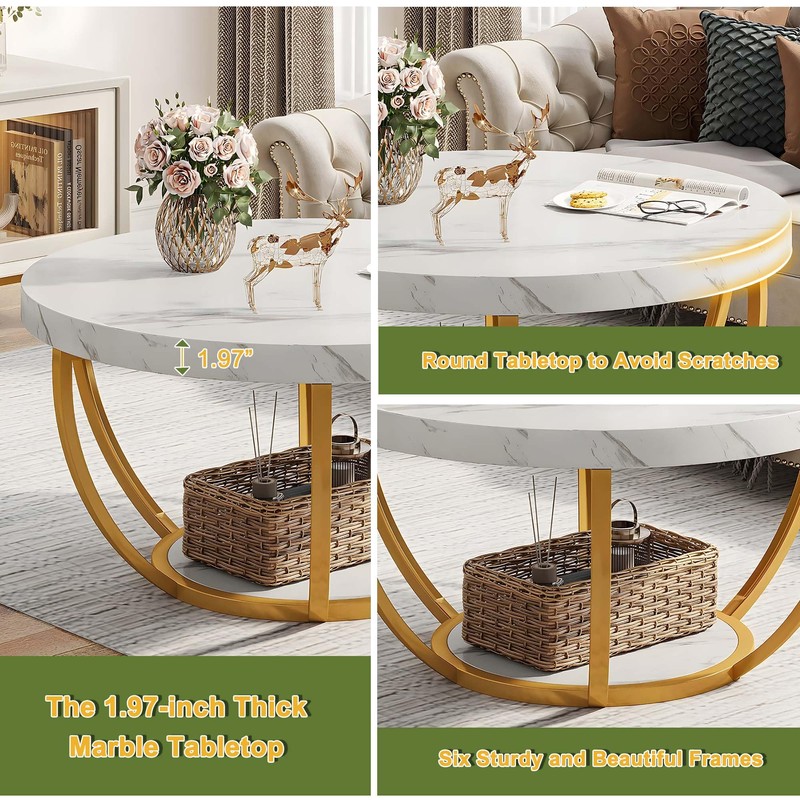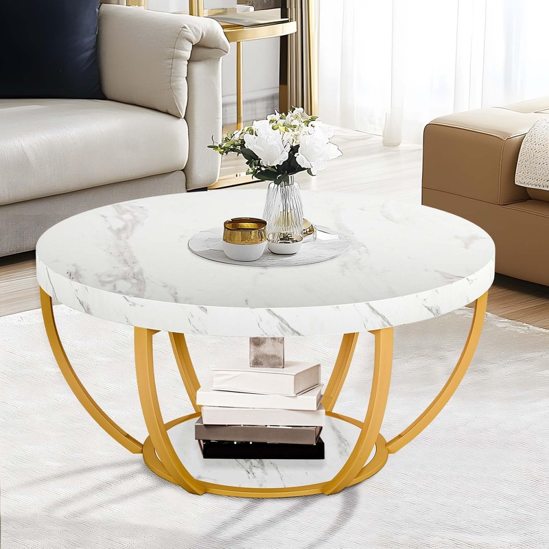 NicBex Round Marble Coffee Table With Geometric Frame - 32 Inch Large Desktop, Modern Living Room Table With Storage, White + Gold