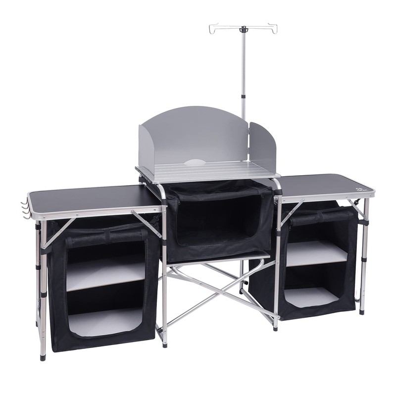 • KITCHEN STATION WITH LIGHT STAND AND WINDSHIELD: Hungry after fun? Enjoy your cooking with this all-in-1 kitchen station. No worry about the wind or light. Hang your light on the light stand and let the aluminum windshield stand for your fire.