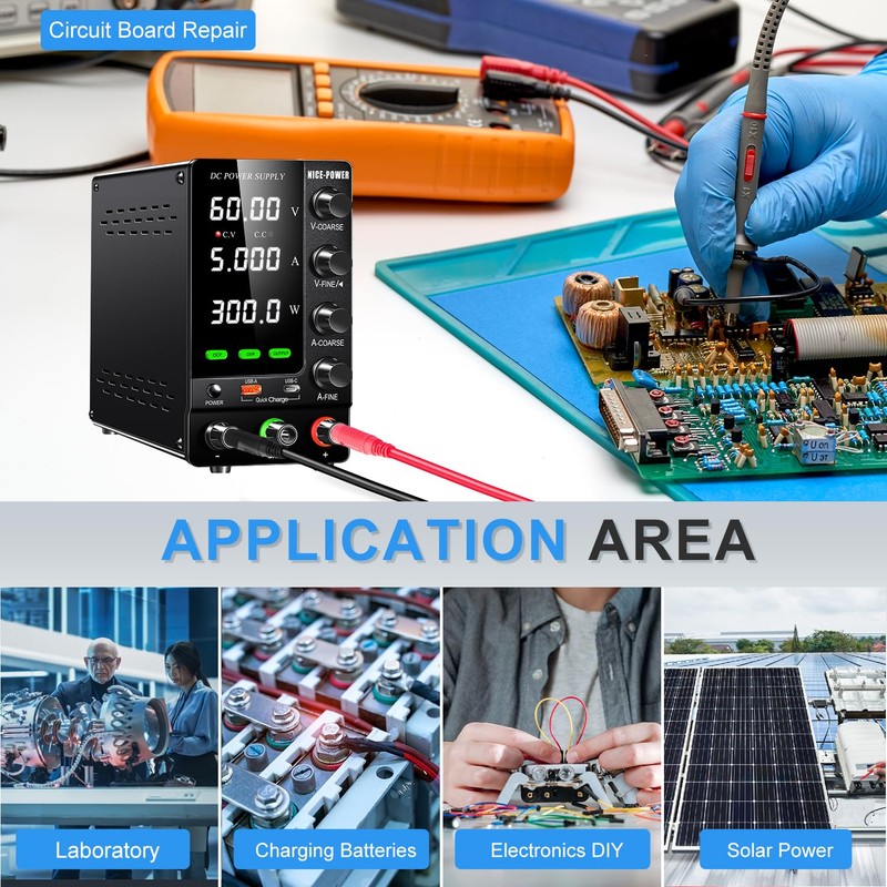 - Reliability & Various Applications: The adjustable DC power supply is built with premium electronic components and reliable circuit designs that include multiple protection functions, such as leakage, grounding terminal, over-voltage, over-current, over-power, over-load, over-temperature, short-circuit protection to ensure stable working performance and prolong the life of the adjustable DC power supply effectively. This benchtop power supply is suitable for battery charging (LiFePO4, lead acid batteries, etc.), electronics repair, anodizing, electrolysis, electroplating, aging test, production line test, DIY, labs, schools, laboratories scientific research and teaching etc.