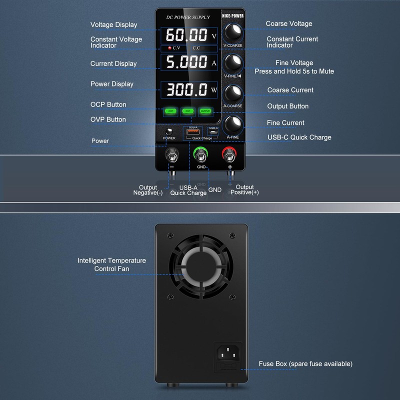 NICE-POWER DC Power Supply Variable 60V 5A, Adjustable Regulated DC Bench Power Supply with Encoder, Output Switch and OCP/OVP, Benchtop Lab Power Supplies 4-Digit LED Display with USB Quick Charge