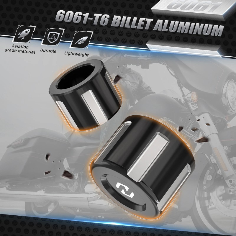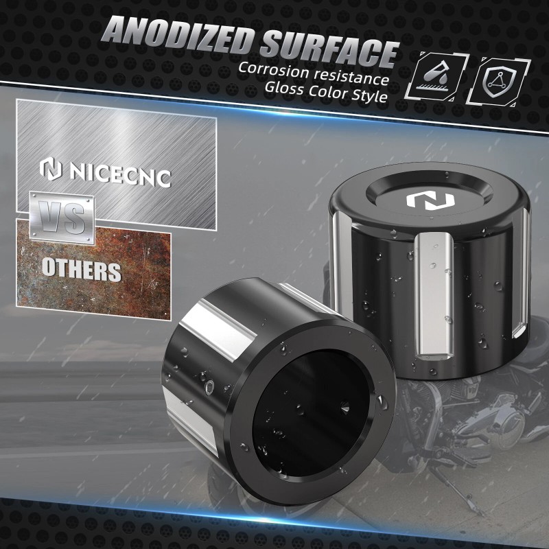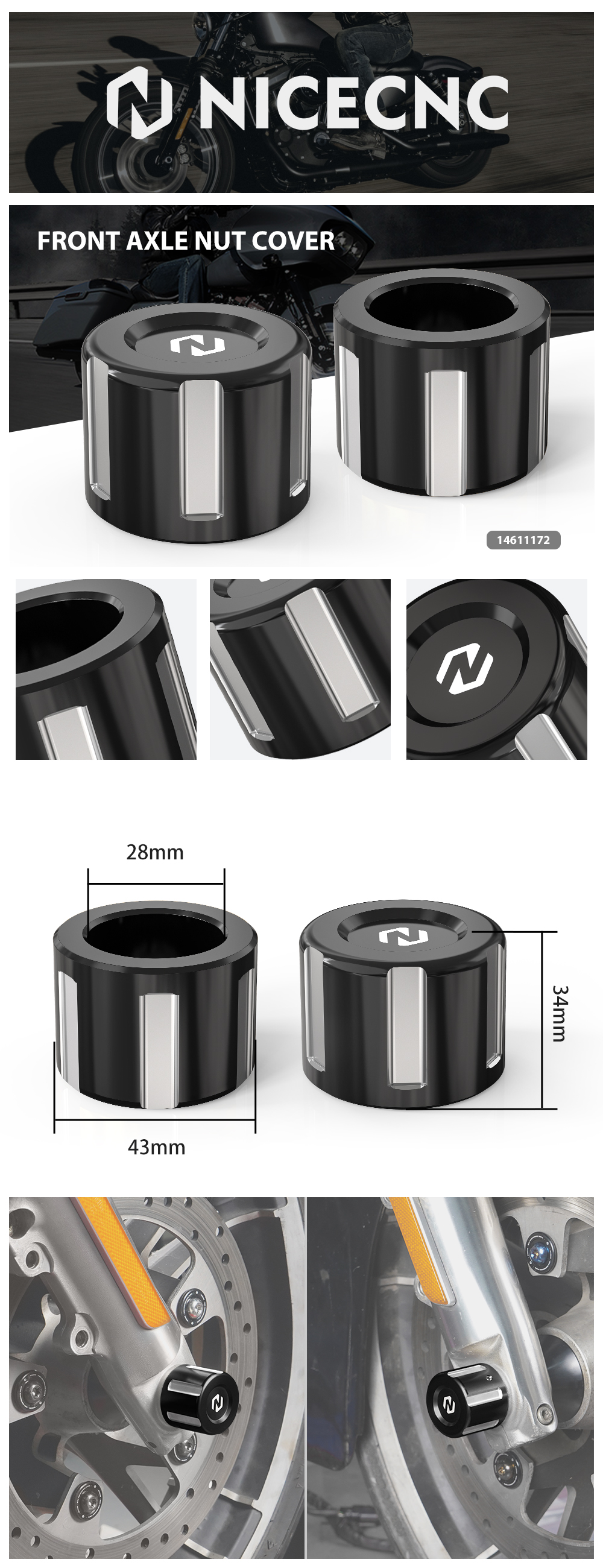 NICECNC brand new front axle nut covers was made of aviation-grade 6061 aluminum alloy, which protect front axle hardware from dirt, moisture, dust and other outer damages.The anodized surface treatment enhances the appearance texture, prevents corrosion and rust. The process is CNC-milled and customized for Harley motorcycles to match the overall style. Sold in pairs , available in 3 colors. New style, upgrade your Harley Front end appearance, and create your unique motorcycle style.
