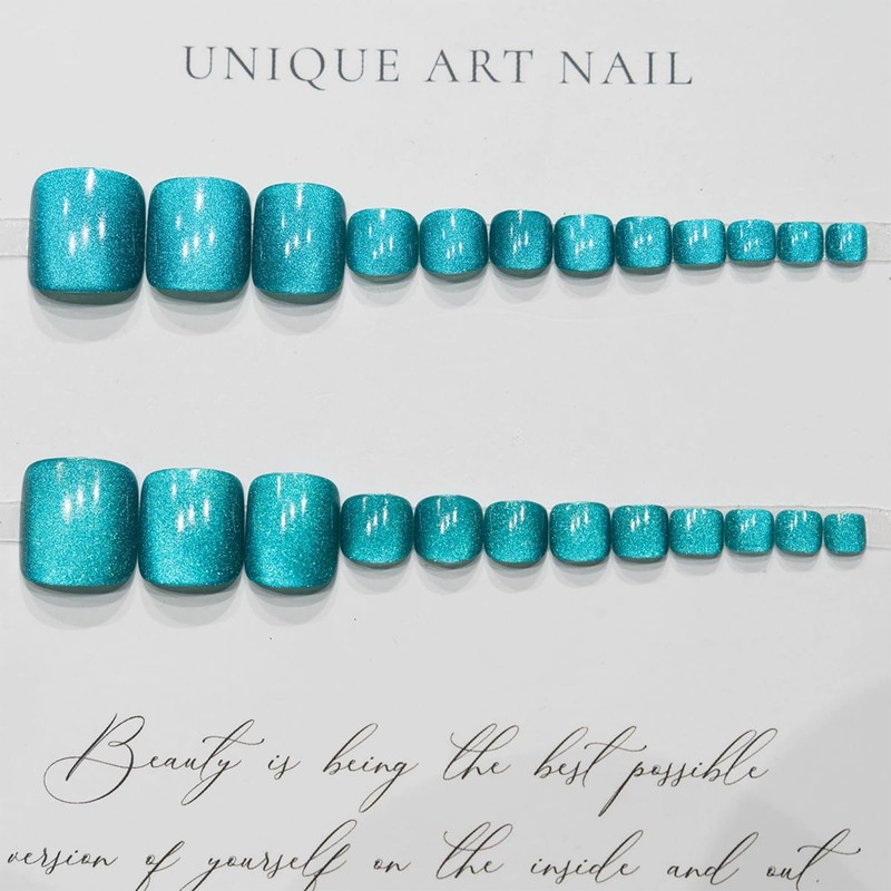 NICENEEDED 24 PCS Blue Press on Toenails, Short Sqaure Shiny Glossy false Toe Nails, Peacock Cat Eye Toenail, Plastics Artificial False Manicure Decoration for Women