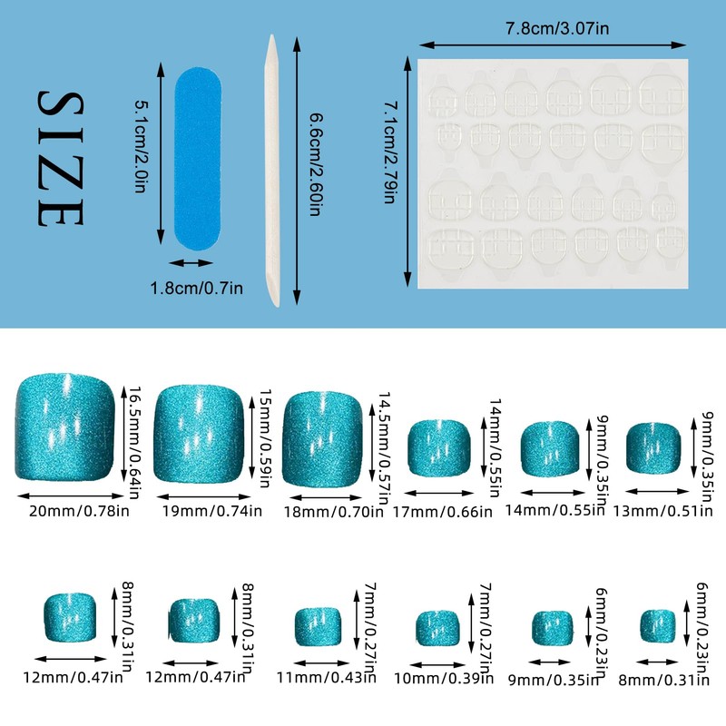 - Product Contents: Includes 24 blue false toenails with glitter designs, 1 mini nail file, 24 double-sided nail stickers, 1 alcohol pad, and 1 wooden stick. You can easily trim and shape the nails to your preferred length and style