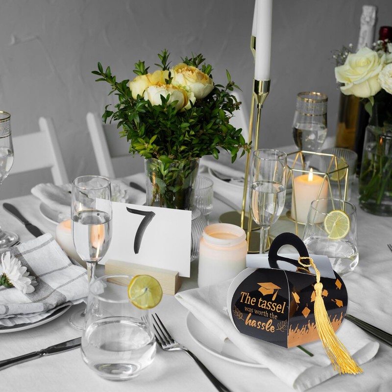 - Quantity: This package includes 30 cap-shaped themed gift boxes with 30 gold tassels, plenty of quantity to suit all party needs