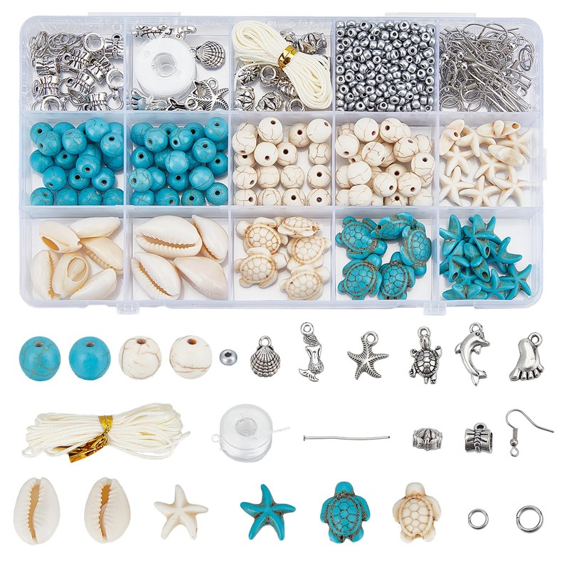 - OCEAN-THEMED BEAD SET: This set includes variety different types of beads such as turquoise beads, shell beads, spacer beads, starfish beads, turtle beads. Great for creating jewelry pieces like necklaces, and more to capture a summer vibe
