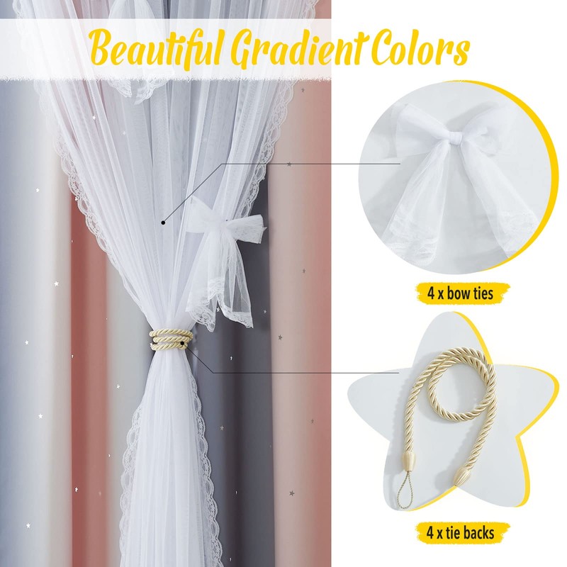 - Hollow Star: Star cutout double layer rainbow curtains decorate your windows with distinctive style. Imagine the sunshine through the hollow stars into the room, casting a beautiful shadow. There is a feeling of moving the stars into the house.