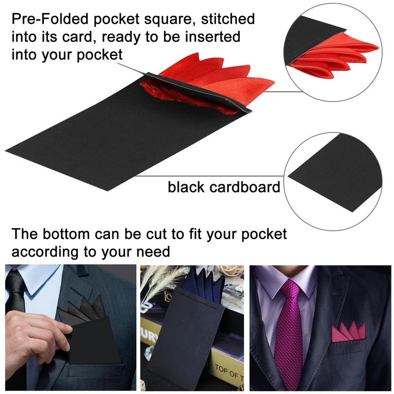 - MATERIAL Made of polyester, these pocket squares are pre-folded into triangle shape for ease of use. The bottom is made of black cardboard, it can be cut to fit the pocket of your suit according to your needs