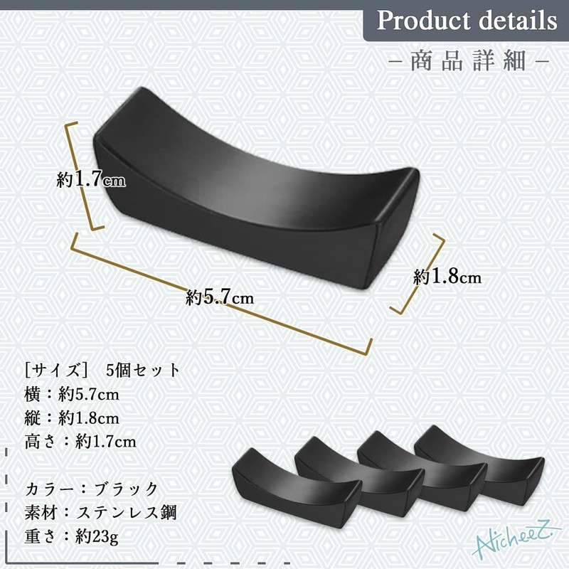- [Product Details] Stainless steel chopstick rest; Number of sets: 5 pieces; Material: Stainless steel; Size: Width approx. 2.2 inches (5.7 cm); Height approx. 0.7 inches (1.8 cm); Weight: approx. 0.8 oz (23 g); Color: Black