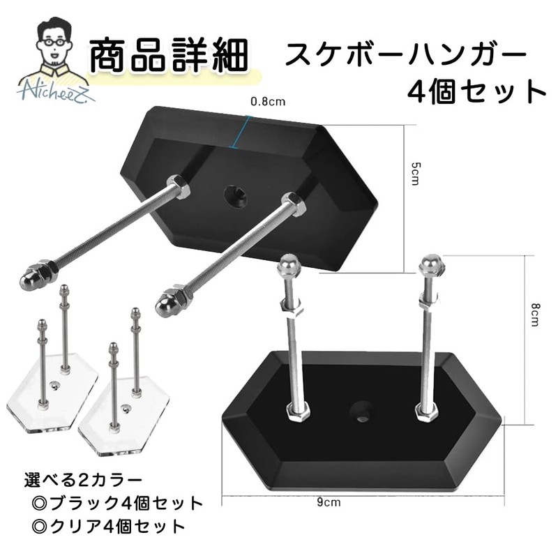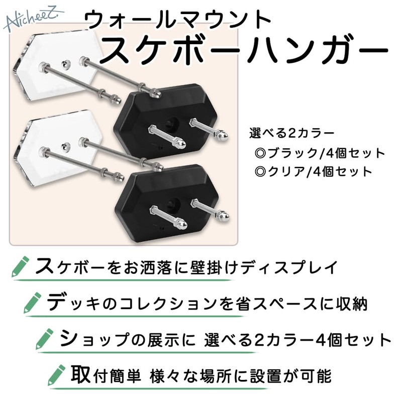 - [Product Details] Skateboard Hangers (Set of 4) Color: Black/Clear; Size: Base Portion Width: Approx. 3.5 inches (9 cm); Base Height: Approx. 2.0 inches (5 cm); Base Thickness: Approx. 0.3 inches (0.8 cm); Screw Length: Approx. 3.1 inches (8 cm)