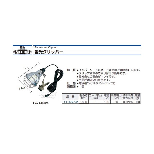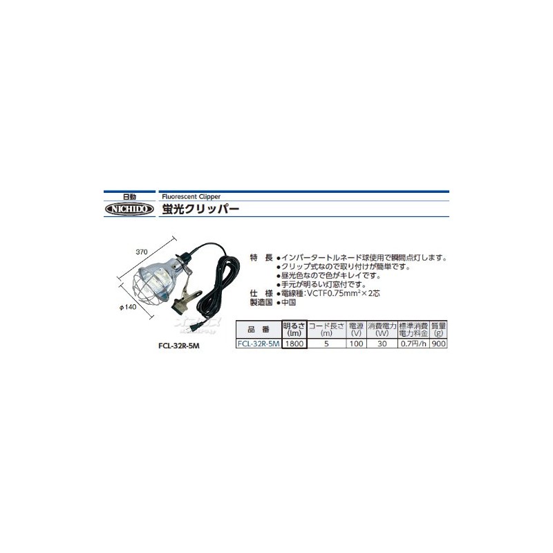 Nichido FCL-32R-5M Fluorescent 32W Inverter Type Fluorescent Clipper 32W 5m