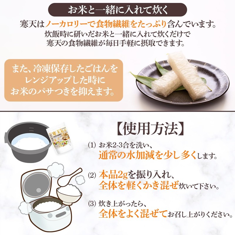 - If you add agar when cooking rice: For 10% rice, the ratio of about 0.04 oz (1 g) of agar. Please add agar before cooking. By adding agar, the rice is sticky and delicious. Even cold rice will be delicious