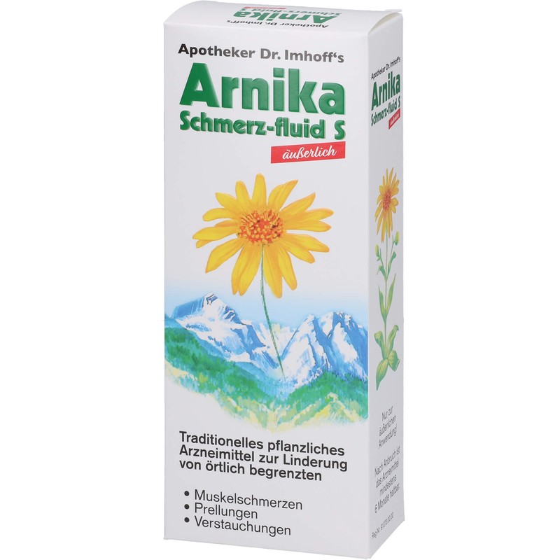Apotheker Dr. Imhoff's Schmerz-fluid S Arnikablüten-Tinktur. Anwendungsgebiete: zur Linderung von örtlich begrenzten Muskelschmerzen, Prellungen und Verstauchungen.