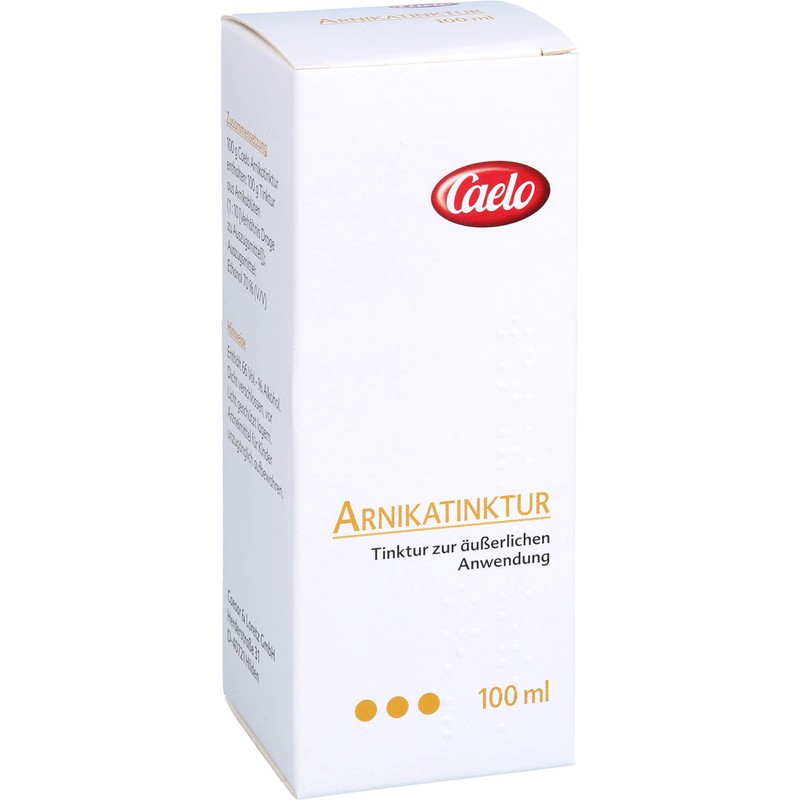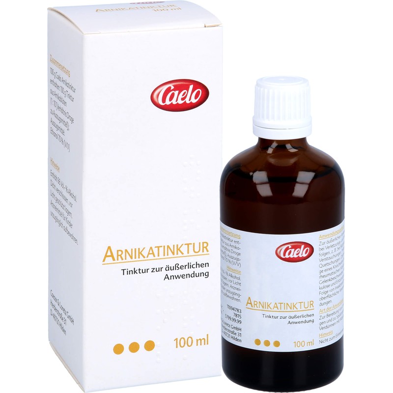 Caelo Arnikatinktur. Anwendungsgebiete: zur äußerlichen Anwendung bei Verletzungs- und Unfallfolgen, z.B. bei Blutergüssen, Verstauchungen, Prellungen, Quetschungen, Ödemen infolge eines Knochenbruchs, bei rheumatischen Muskel- und Gelenkbeschwerden Furunkulose und Entzündungen als Folge von Insektenstichen oberflächliche Venenentzündungen. Warnhinweis: Enthält 66 Vol.-% Alkohol!
