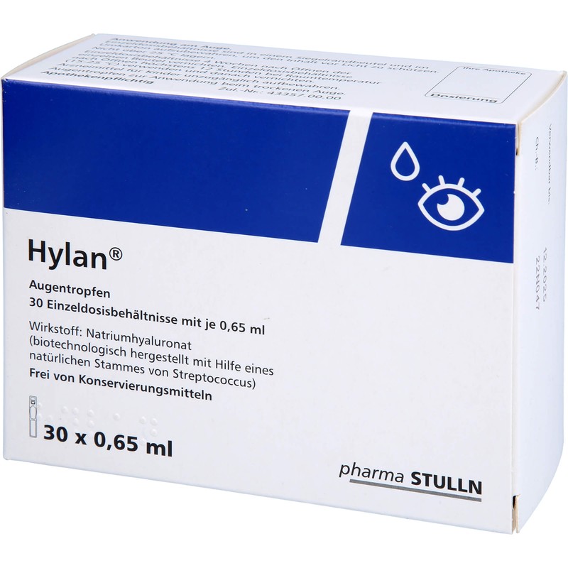 Hylan. Wirkstoff: Natriumhyaluronat. Anwendungsgebiete: Dieses Arzneimittel wird zur symptomatischen Behandlung beim trockenen Auge (Dry Eye Syndrom) eingesetzt.
