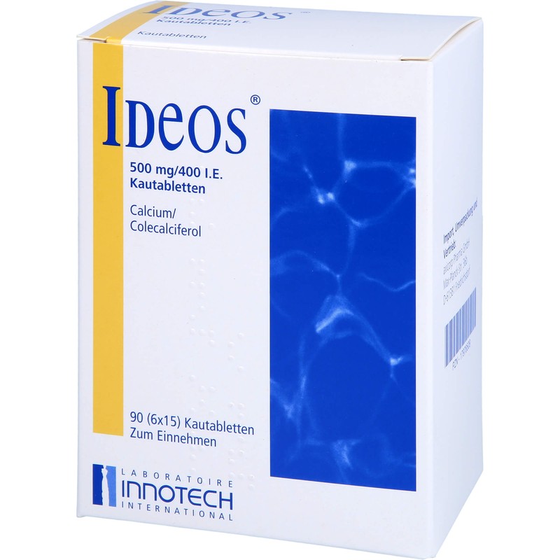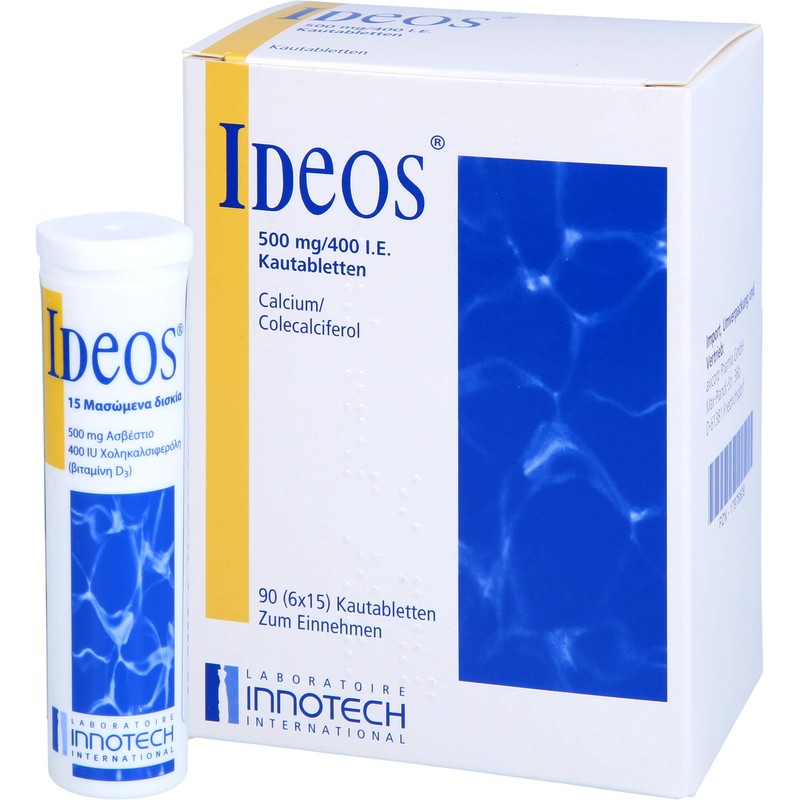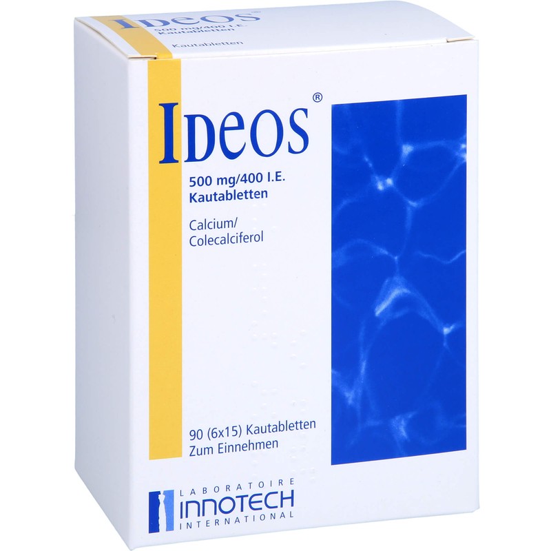 Ideos 500 mg/400 IE Kautabletten. Wirkstoff: Calciumcarbonat, Colecalciferol. Anwendungsgebiete: In Fällen eines kombinierten Vitamin-D- und Calcium-Mangels bei älteren Patienten und im Zusammenhang mit einigen Behandlungsmöglichkeiten bei Osteoporose (eine Erkrankung, bei der Knochensubstanz abgebaut wird und die Brüchigkeit der Knochen zunimmt), sofern ein Mangel an Vitamin D und Calcium oder das Risiko für einen solchen Mangel besteht. Warnhinweis: Enthält Sorbitol (E420), Sucrose (Zucker) und partiell hydriertes Sojaöl.