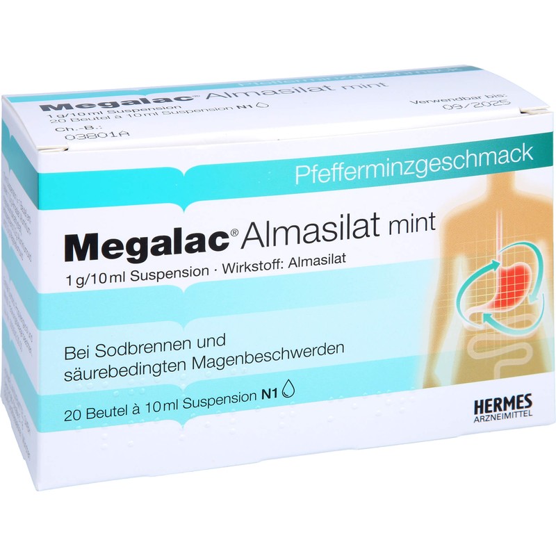 Megalac Almasilat mint 1 g/10 ml Suspension. Wirkstoff: Almasilat. Anwendungsgebiete: Zur symptomatischen Behandlung von Erkrankungen, bei denen die Magensäure gebunden werden soll: Magen- und Zwölffingerdarmgeschwüre, Sodbrennen und säurebedingte Magenbeschwerden. Warnhinweis: Enthält Sorbitol und Propylenglycol.