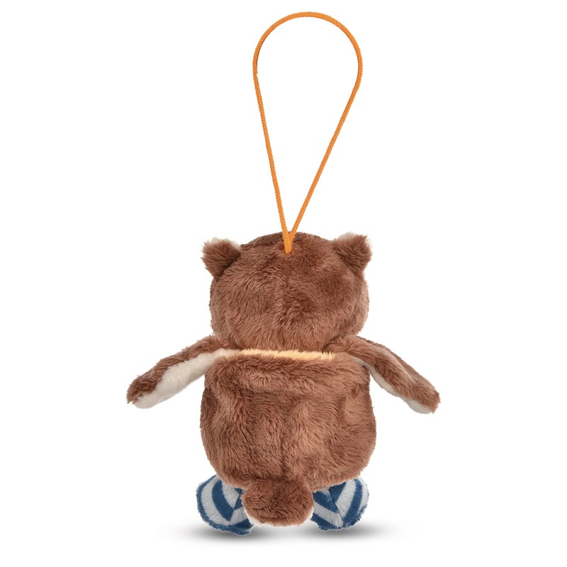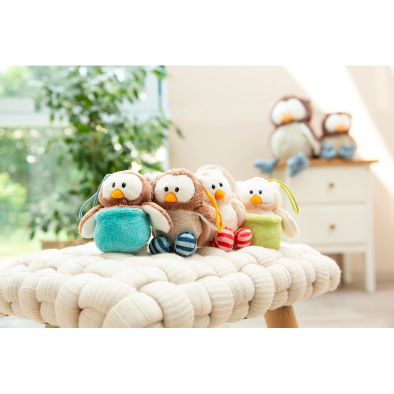 - Oscar the owl – The cute Oscar owl with funny curled socks is made from a fluffy soft plush and equipped with a loop on the head; the highlight of Oscar is that he can sit as a reversible cuddly toy on the one hand in his yellow plush nest and as soon as the cot bumper is turned, space for small accessories on Oscar's back; the funny plush pendant can be easily attached to bags, backpacks. or schoolbags attached to the and is an unusual souvenir, not only for owl fans