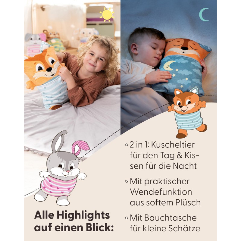 - Fun and imagination: the Cosidoo Fox accompanies children through the day and night - with a twist it switches between your cheerful playmate and soothing sleeping companion