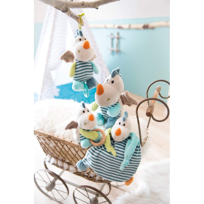 - The cute dragon Draguli is a plush friend and grasping toy in one. It is made from high-quality NICI plush material and comes with integrated bell in the stomach, which rewards the first attempts to move with a gentle sound. The grasping toy is suitable for babies from three months and trains fine motor skills as well as sense of touch and hearing. The different fabrics offer baby tactile charms and invite you to discover and grasp. A wooden ring held between the two arms of the dragon draguli with a Velcro fastener can be easily removed for washing. The wooden ring can also help with teething because it gives baby relief by simply chewing it.