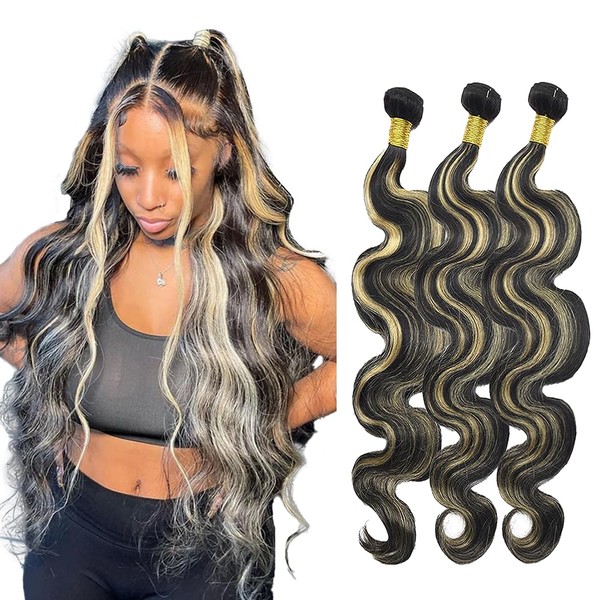 Niciitysi Highlight Human Hair P1B27 Body Wave Bundles 18 20 22 inch Ombre Two Tone Black Mixed With Honey Blonde Bundles Double Weft Brazilian Hair Extensions for Women