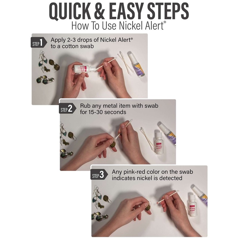 - EASY AND FAST TO USE - This invaluable kit's nickel detection solution can test any metal item in only 30 seconds. Nickel Alert comes in a large, easy-use squeezable bottle - 0.5 ounces!