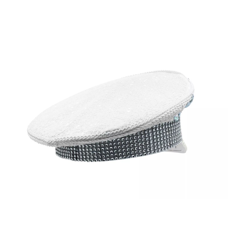 - White Iridescent Gem and Pearl Sequin Captains hat. Hat stands about 6 inches tall and is 10.5 inches long and wide.