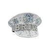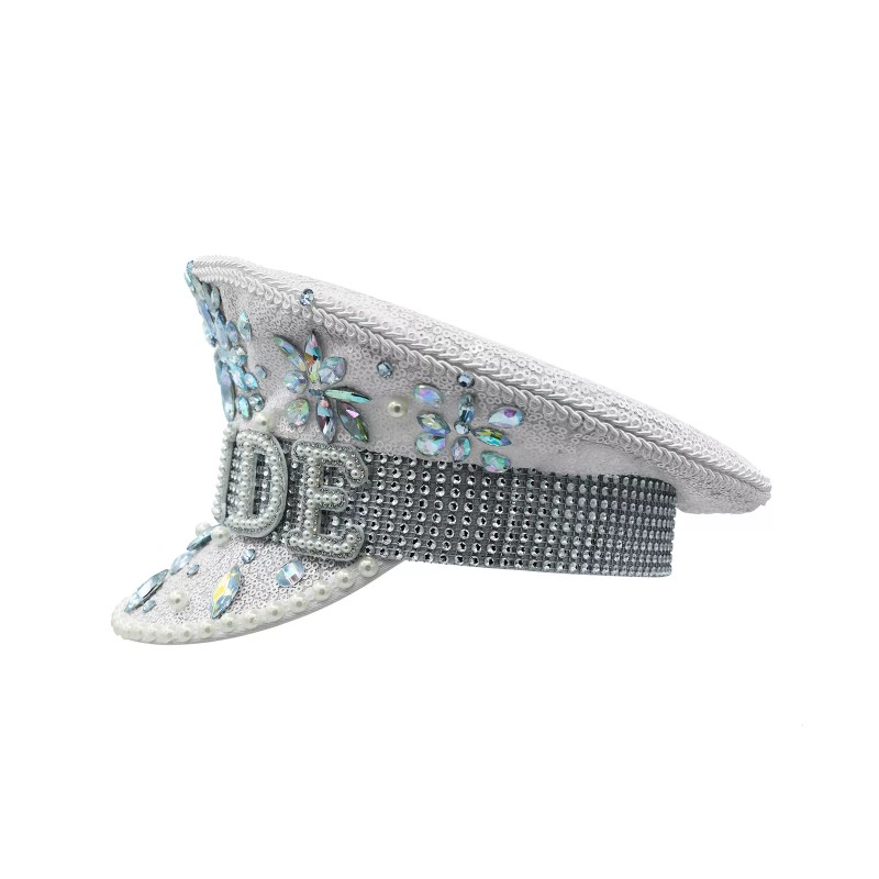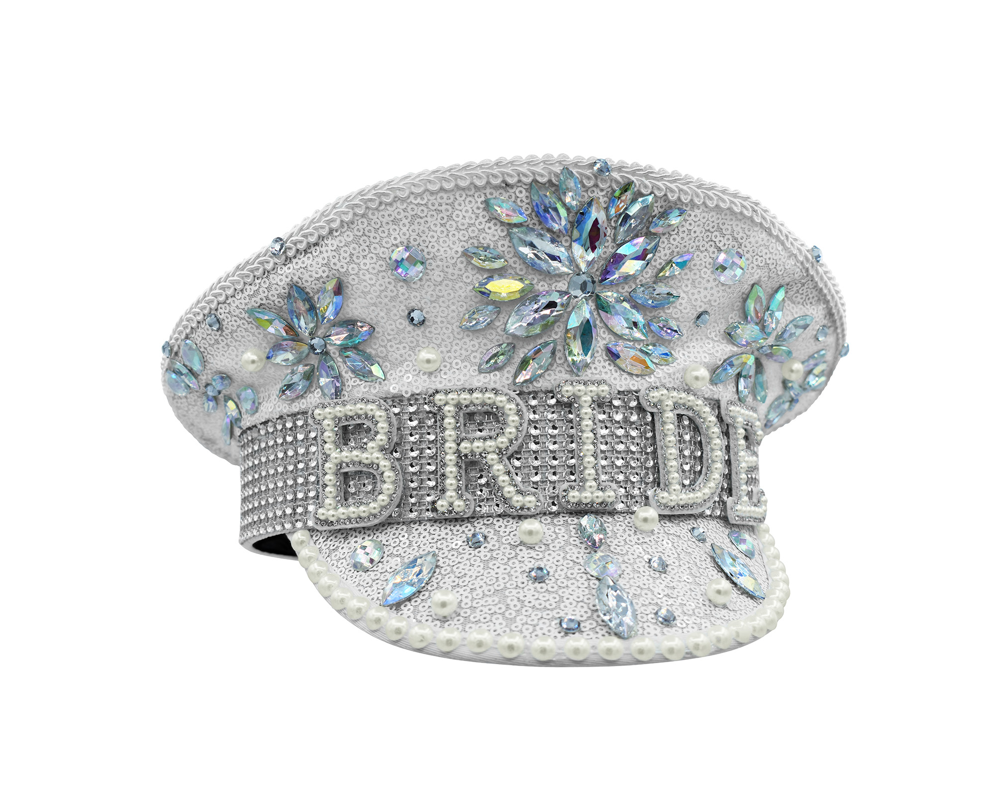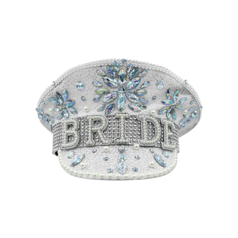 - Featuring a white sequin hat with iridescent gems in flower bursts, faux pears accented with the word BRIDE and brim, with silver rhinestones.