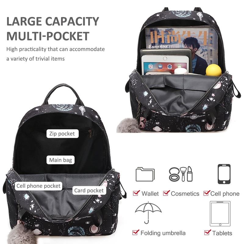 NICOLE & DORIS Lightweight Rucksack for Women Galaxy Backpack Girls Fashion Backpack School Bag Travel Daypack Anti Theft Backpack with Pompom Pink