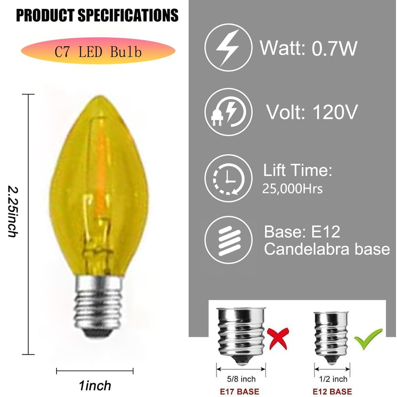 - 【Bulb specification】: 10 PCS C7 {2 Orange + 2 Yellow + 2 Blue + 2 Red + 2 Green } LED bulbs with E12 US Standard Candelabra screw base, 120V / 0.7W , 25,000 hours lifespan, 60 Lumen, 2700K , Dimmable